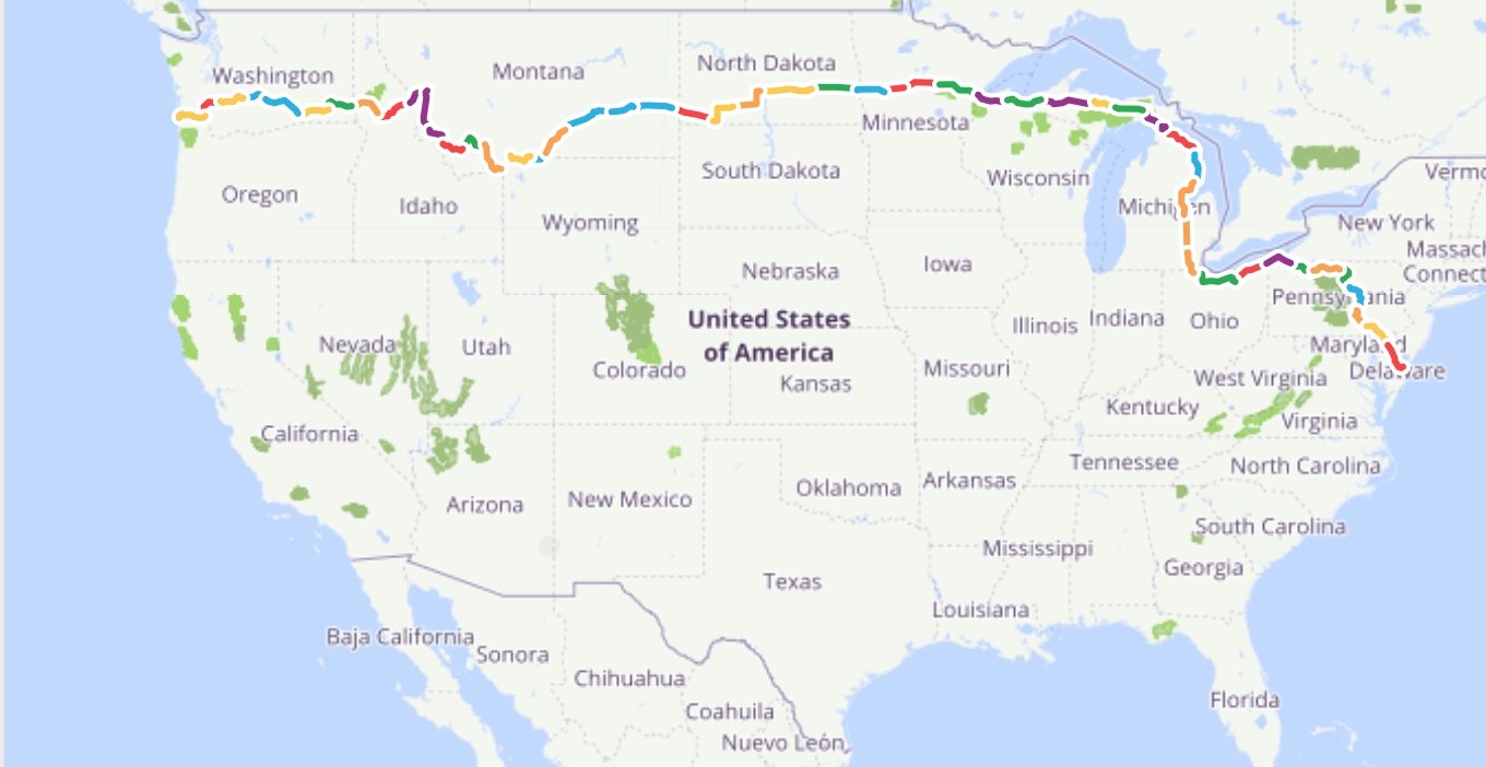If you are going to make a line across the country on a bicycle it seems to be a good idea to track the progress with dots. Several of us will be mapping our with Stava, but we also wanted a map that would show our cumulative progress across the country. The link below will take you to this map and will hopefully resemble this map of our ride days. A dot will drop every 10 mins while we are riding (or stopped), these dots our bounced off a satellite so if the clouds roll in or the signal is interfered with, well, the dots could be off. So don’t be alarmed by wayward dots.